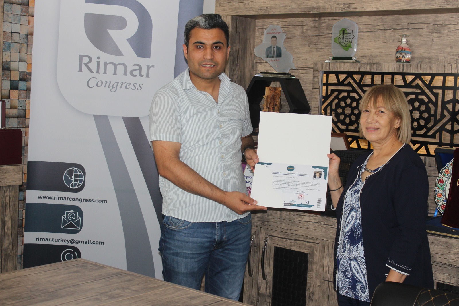 وقام الأستاذ كابلان بتسليم الدكتورة كلثوم شهادة عضوية في أكاديمية ريمار ولتصبح عضوة في الأكاديمية المهتمة بالدراسات والأبحاث وتنظيم المؤتمرات.