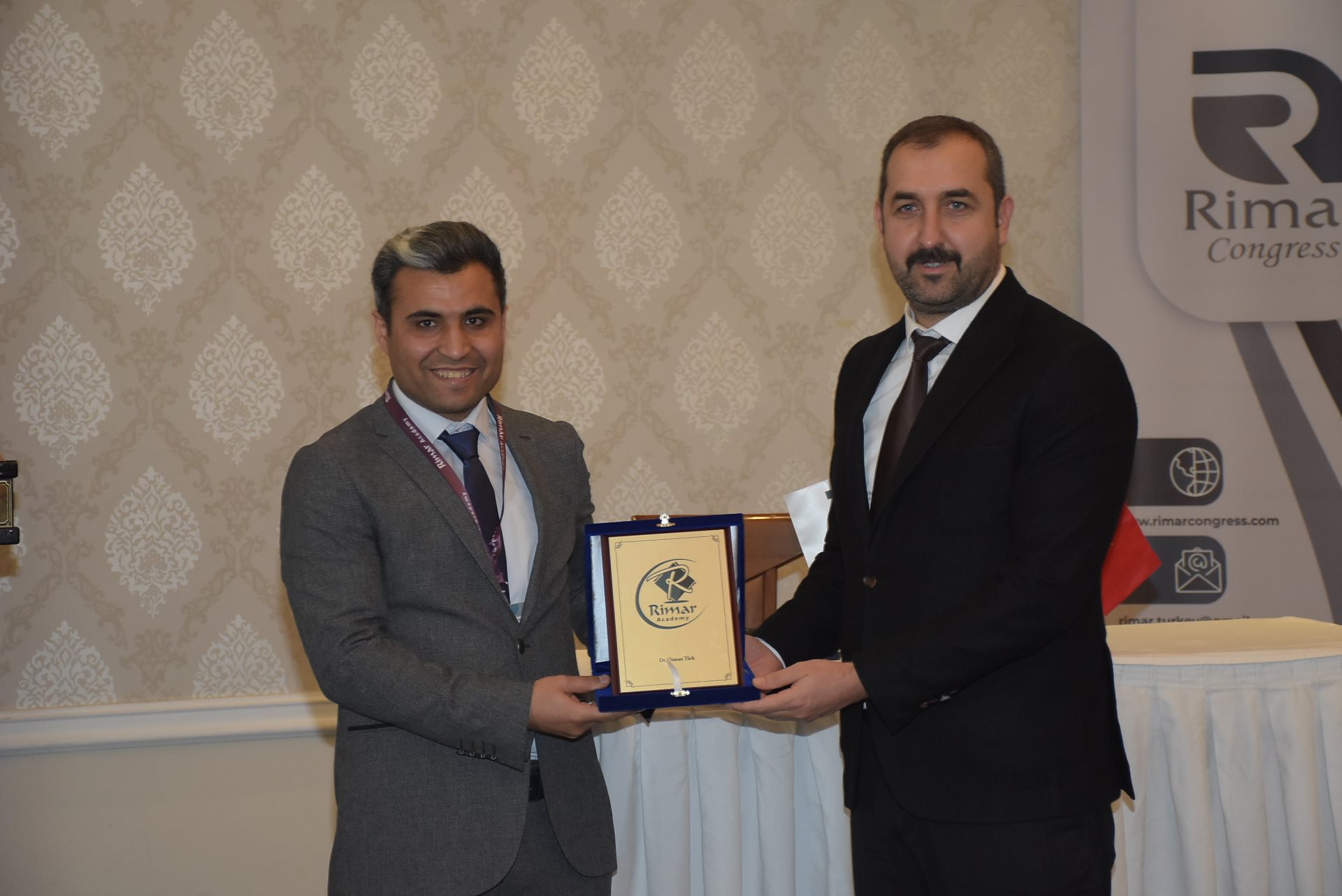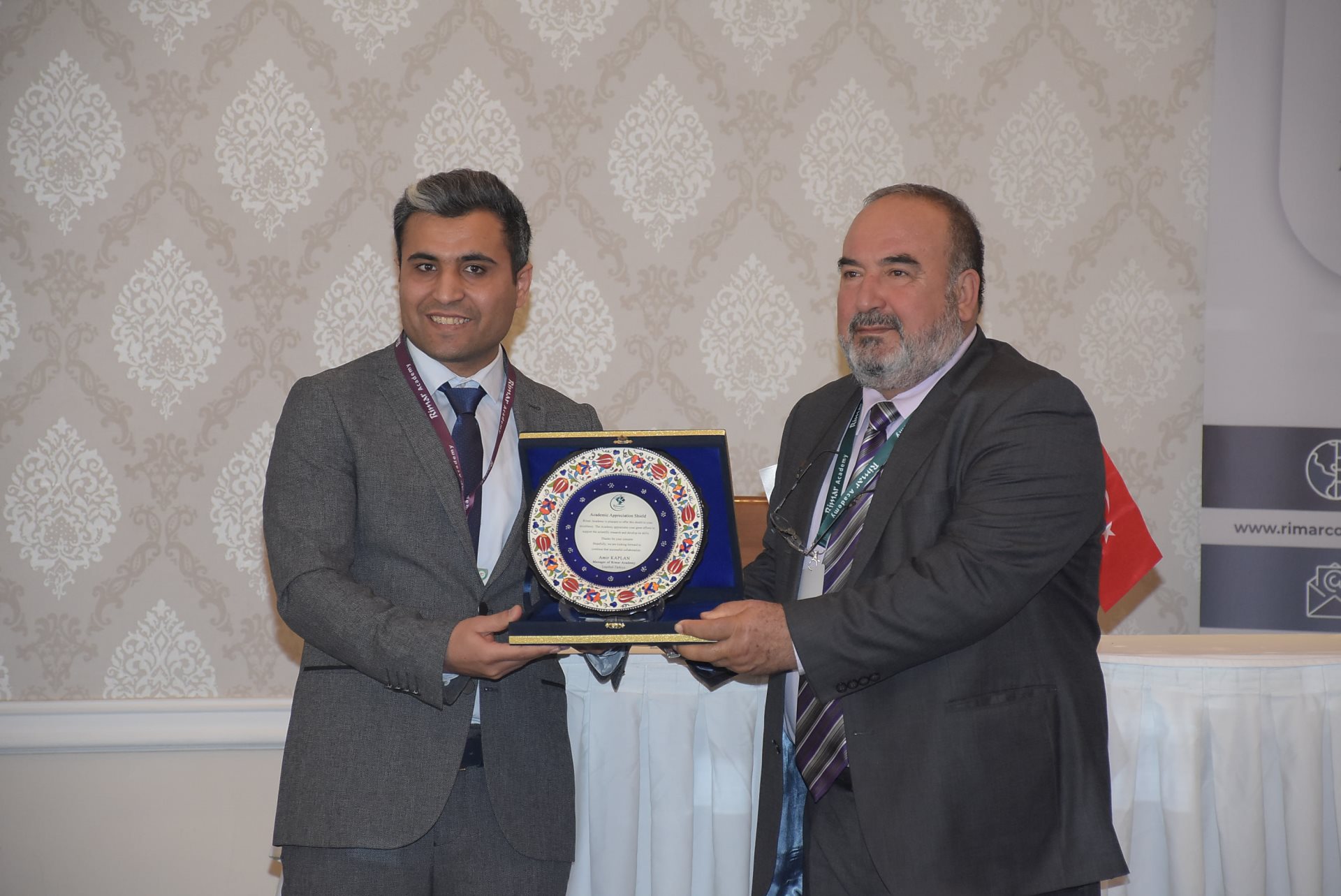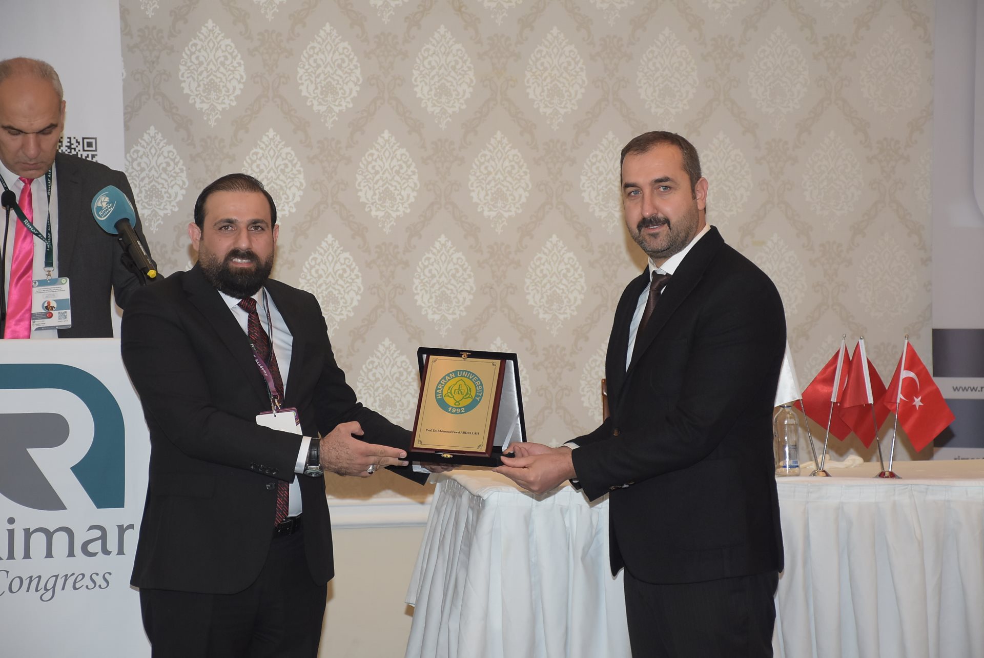 وقدم الأستاذ عامر كابلان مدير أكاديمية درعاً تذكارياً لرئيس المؤتمر البروفيسور أنور تورا ودرعاً تذكارياً آخر قدمه أيضاً إلى ممثل جامعة حران البروفيسور الدكتور عثمان ترك.